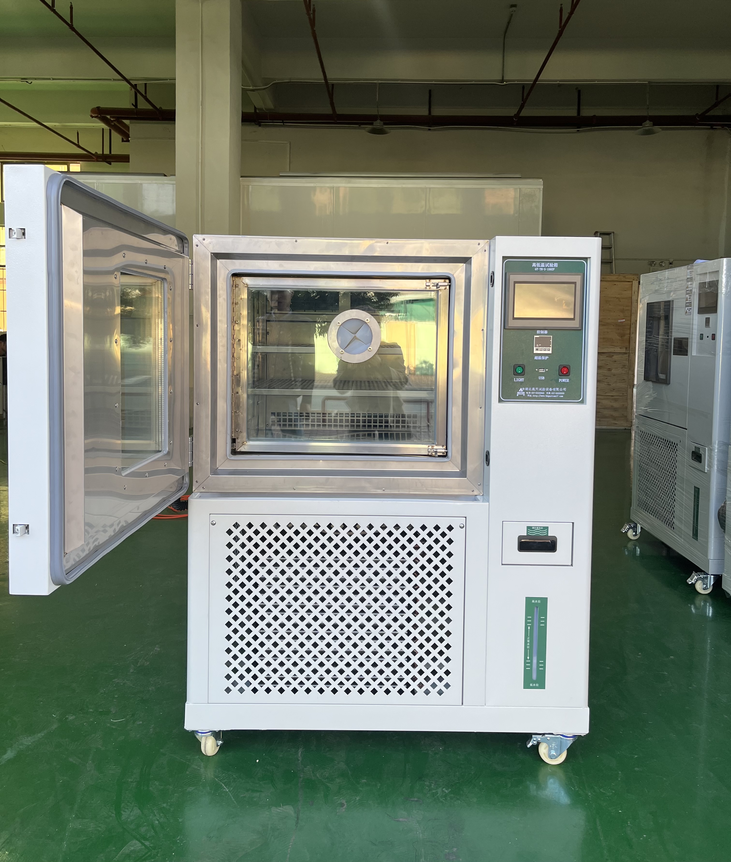 5、箱門中間安裝有導(dǎo)電膜防結(jié)露中空玻璃窗和耐高低溫照明裝置,能清晰地觀察內(nèi)部檢測(cè)項(xiàng)目。